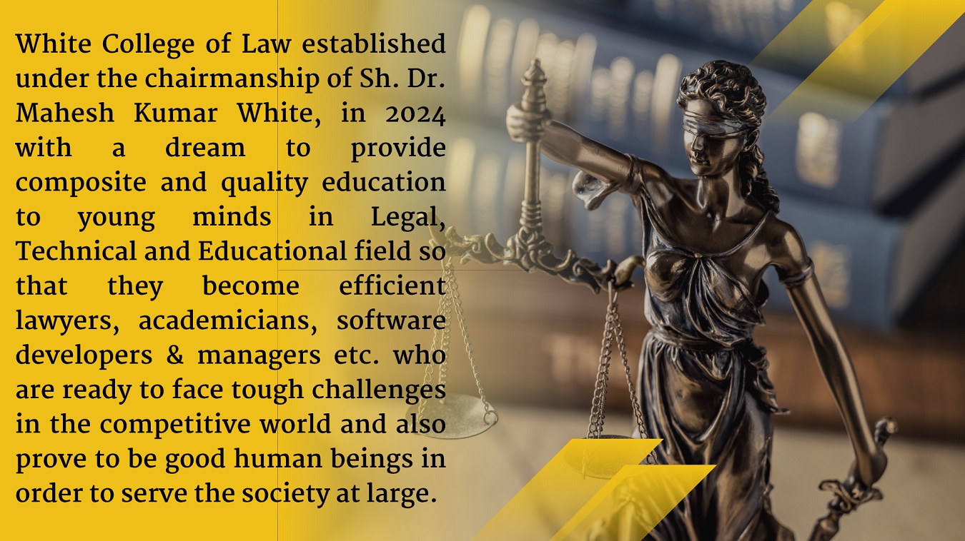 About Us White College of Law established under the chairmanship of Sh. Dr. Mahesh Kumar White, in 2024 with a dream to provide composite and quality education to young minds in Legal, Technical and Educational field so that they become efficient lawyers, academicians, software developers & managers etc. who are ready to face tough challenges in the competitive world and also prove to be good human beings in order to serve the society at large.